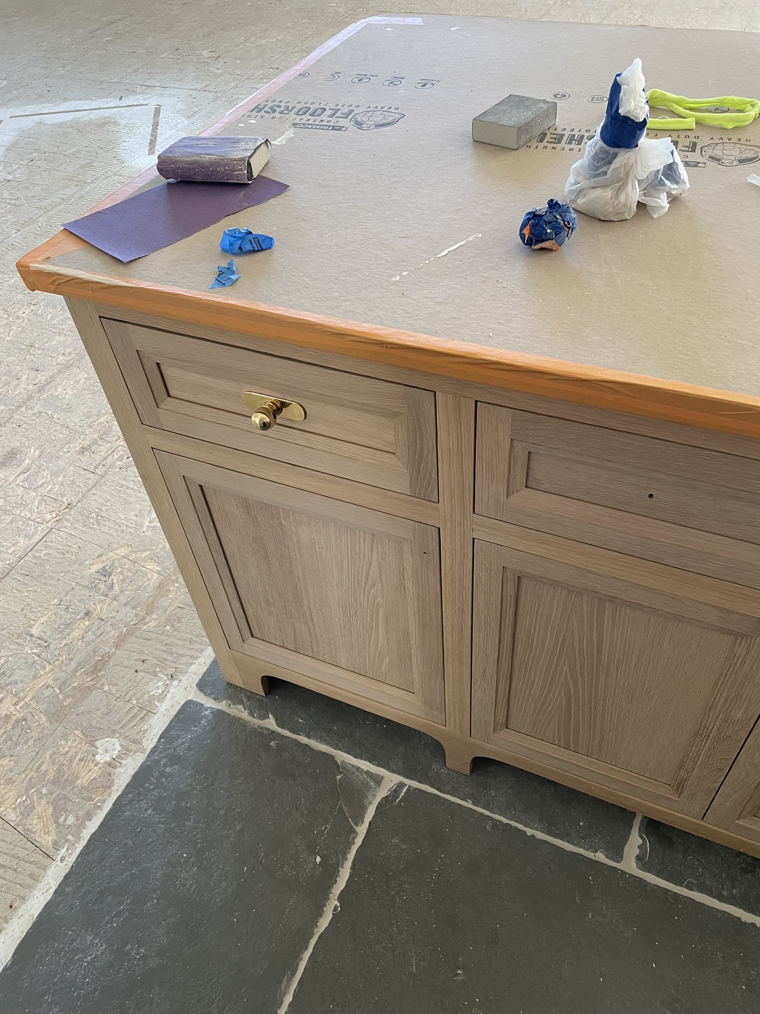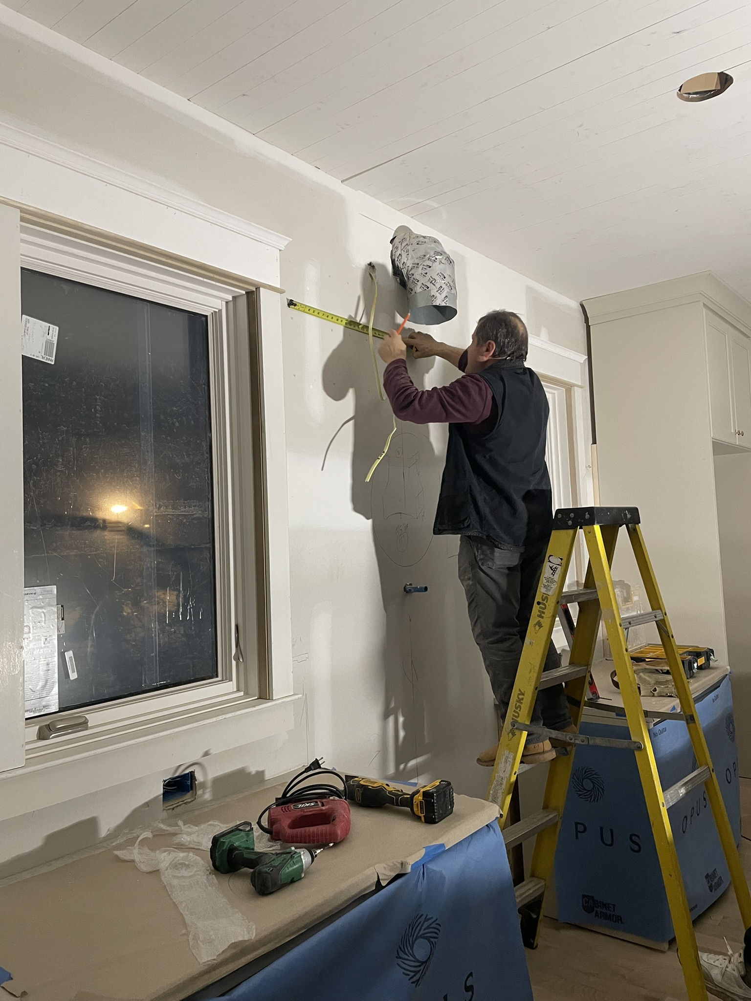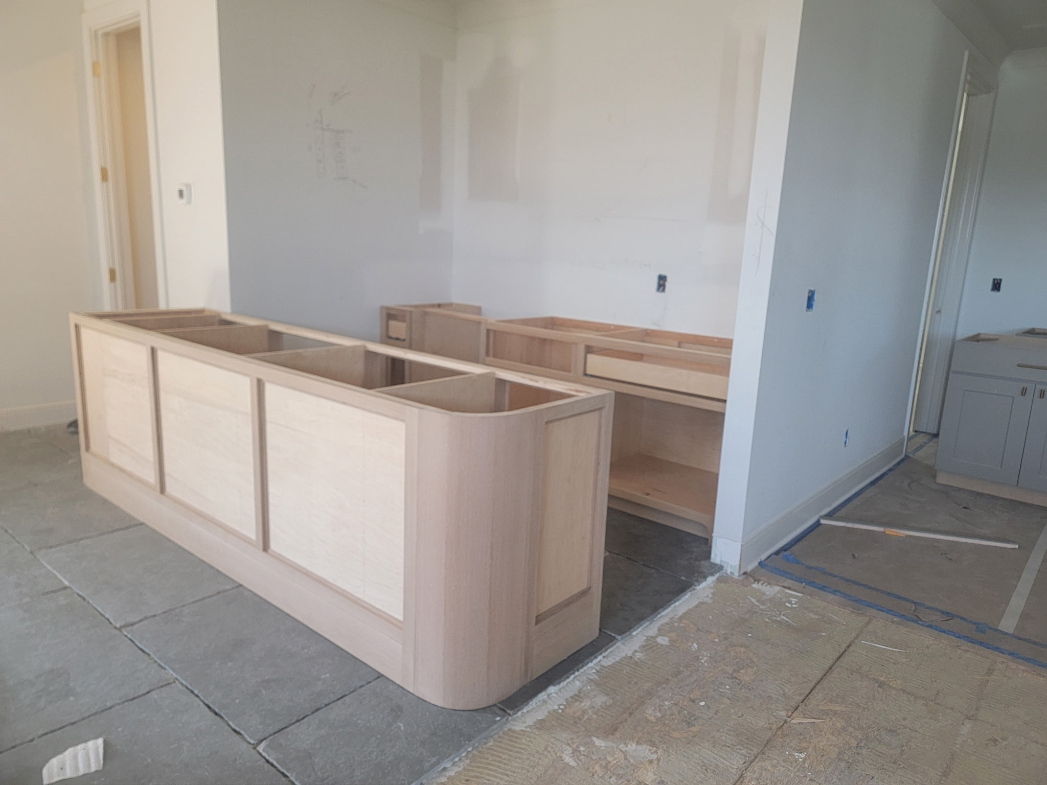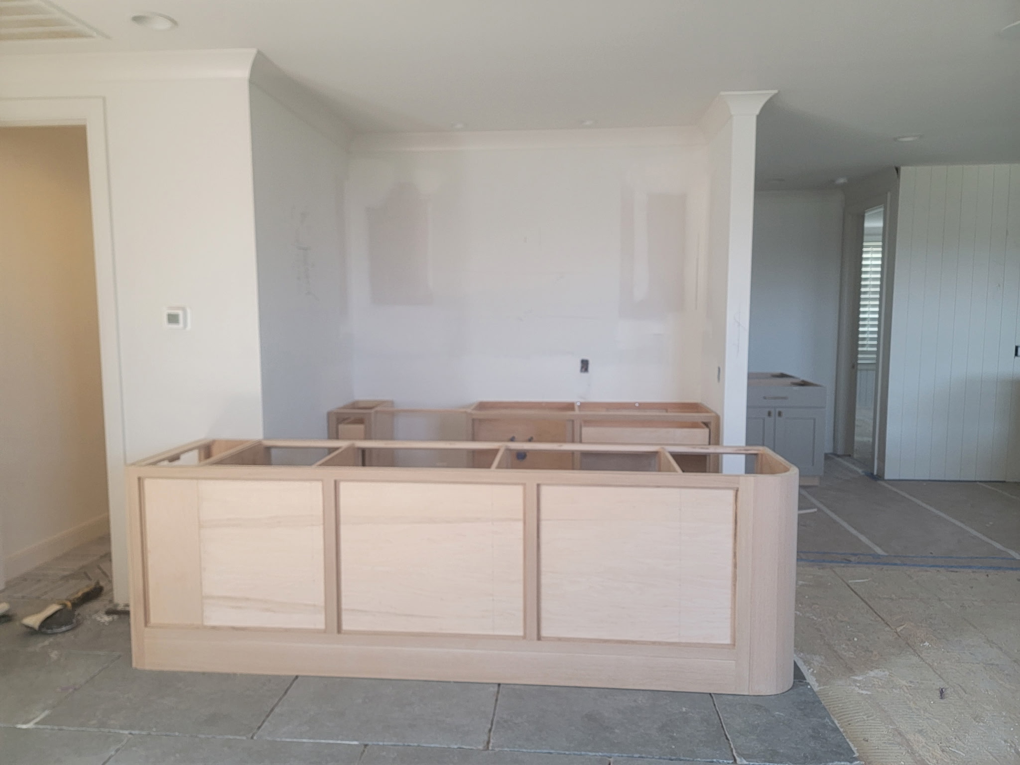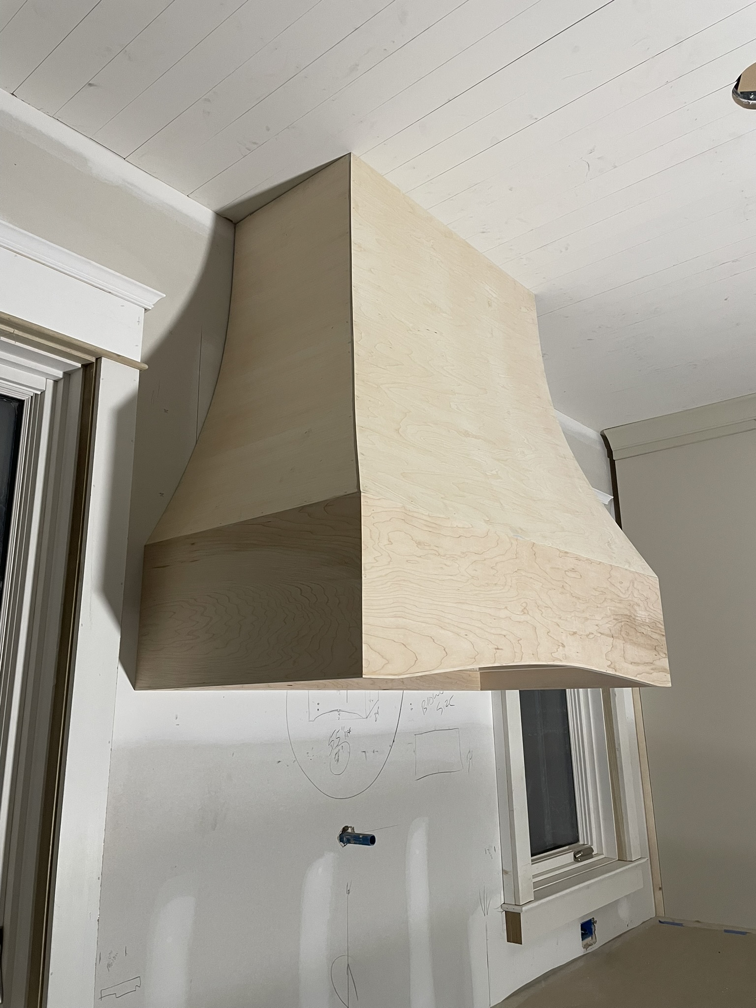 A custom curved kitchen hood, currently being prepped for a plaster finish.