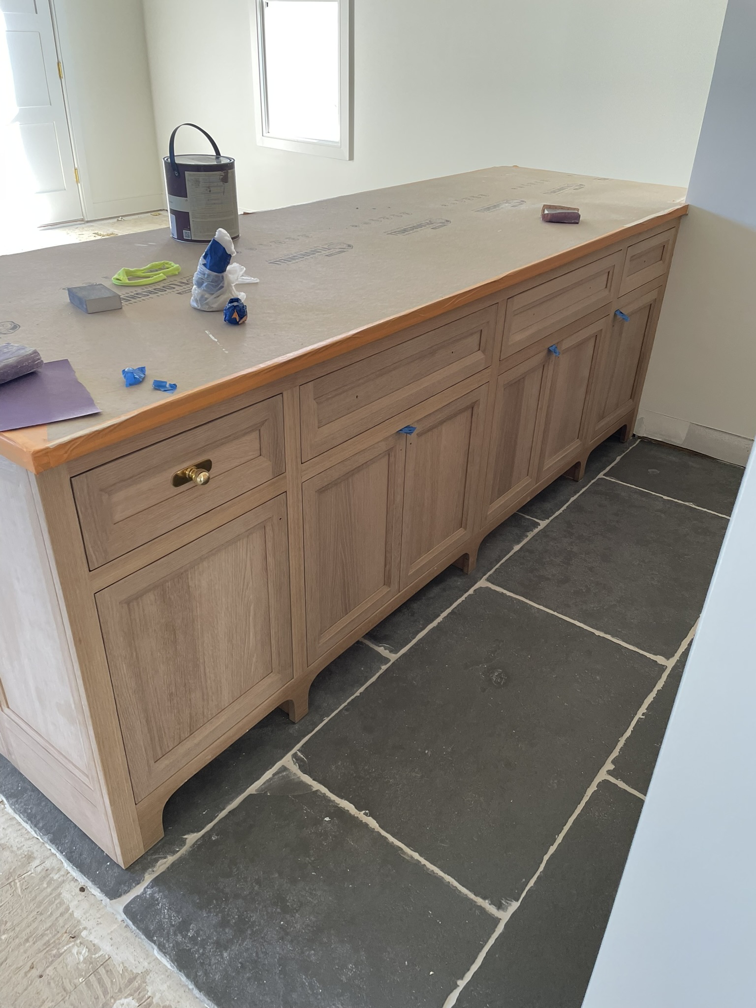 Custom built-ins and kitchen hood upscaling.