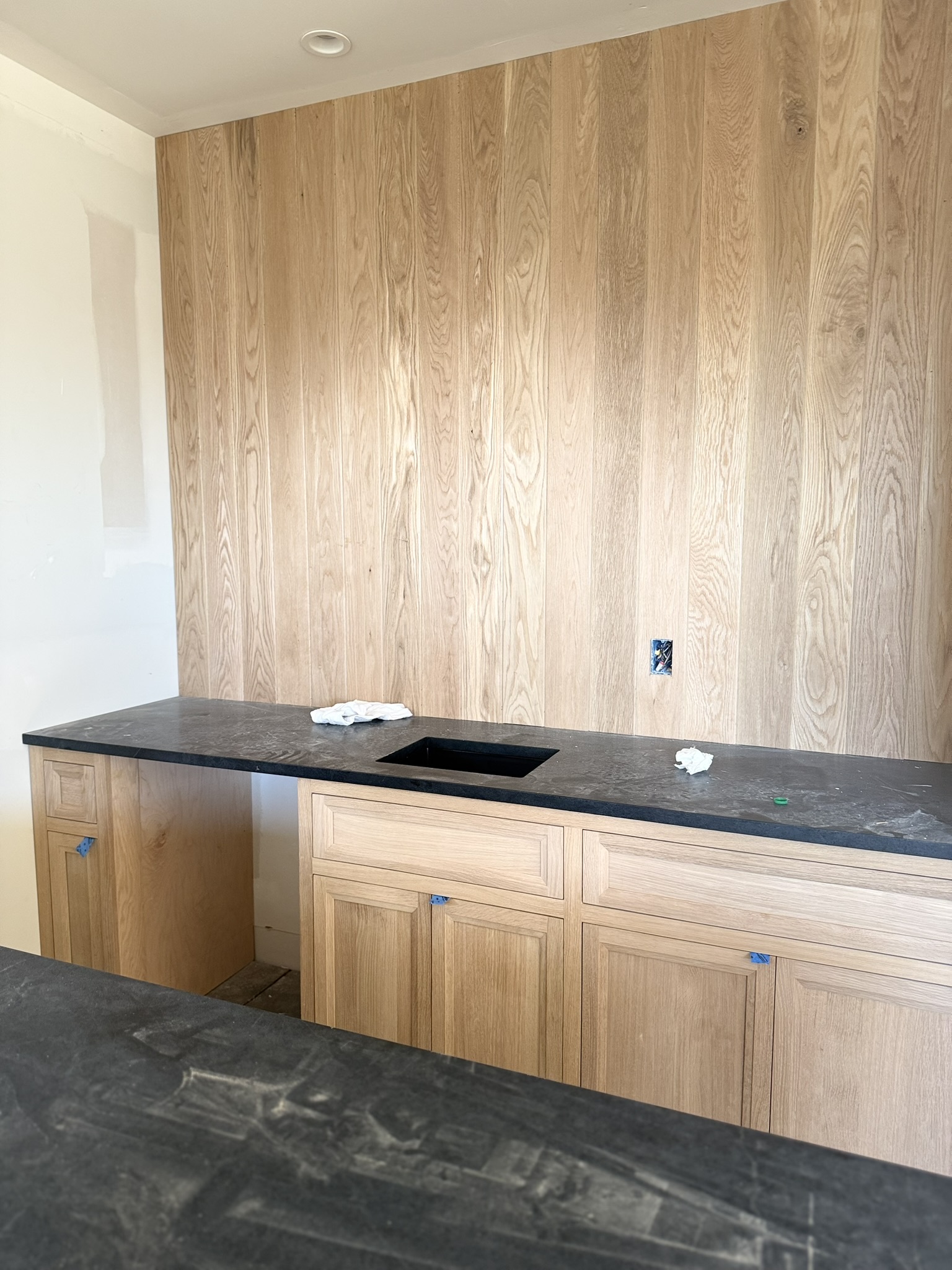 White oak wet bar featuring custom curved corner cabinetry.