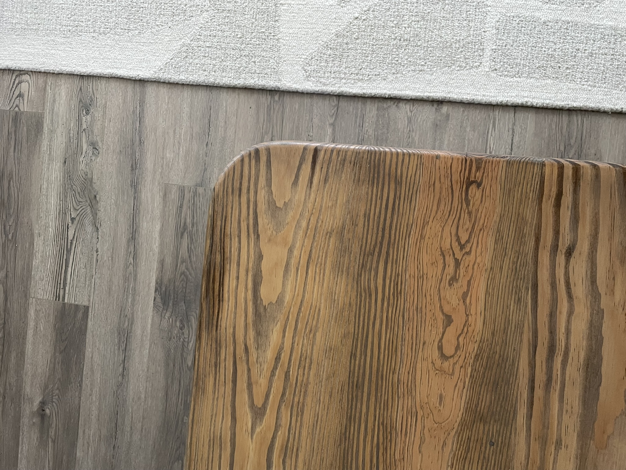 Pine dining table paired with a high-gloss maple storage commode.
